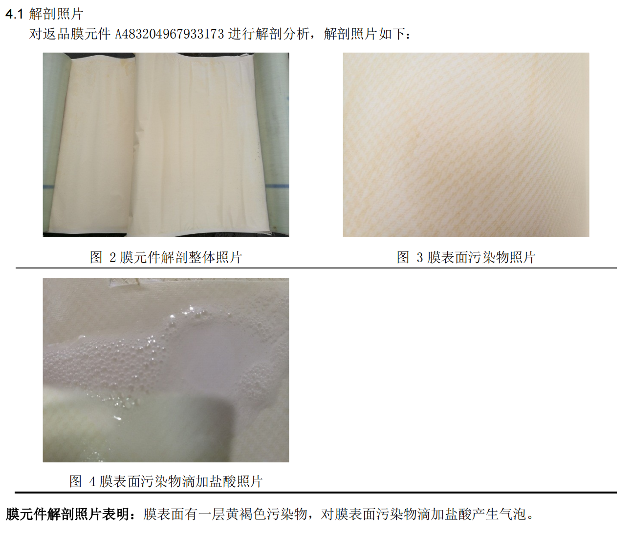 C、 膜元件解剖分析表明膜表面有一層黃色污染物,膜表面滴加鹽酸產(chǎn)生氣泡,說明膜表面存在碳酸鹽結(jié)垢污染。