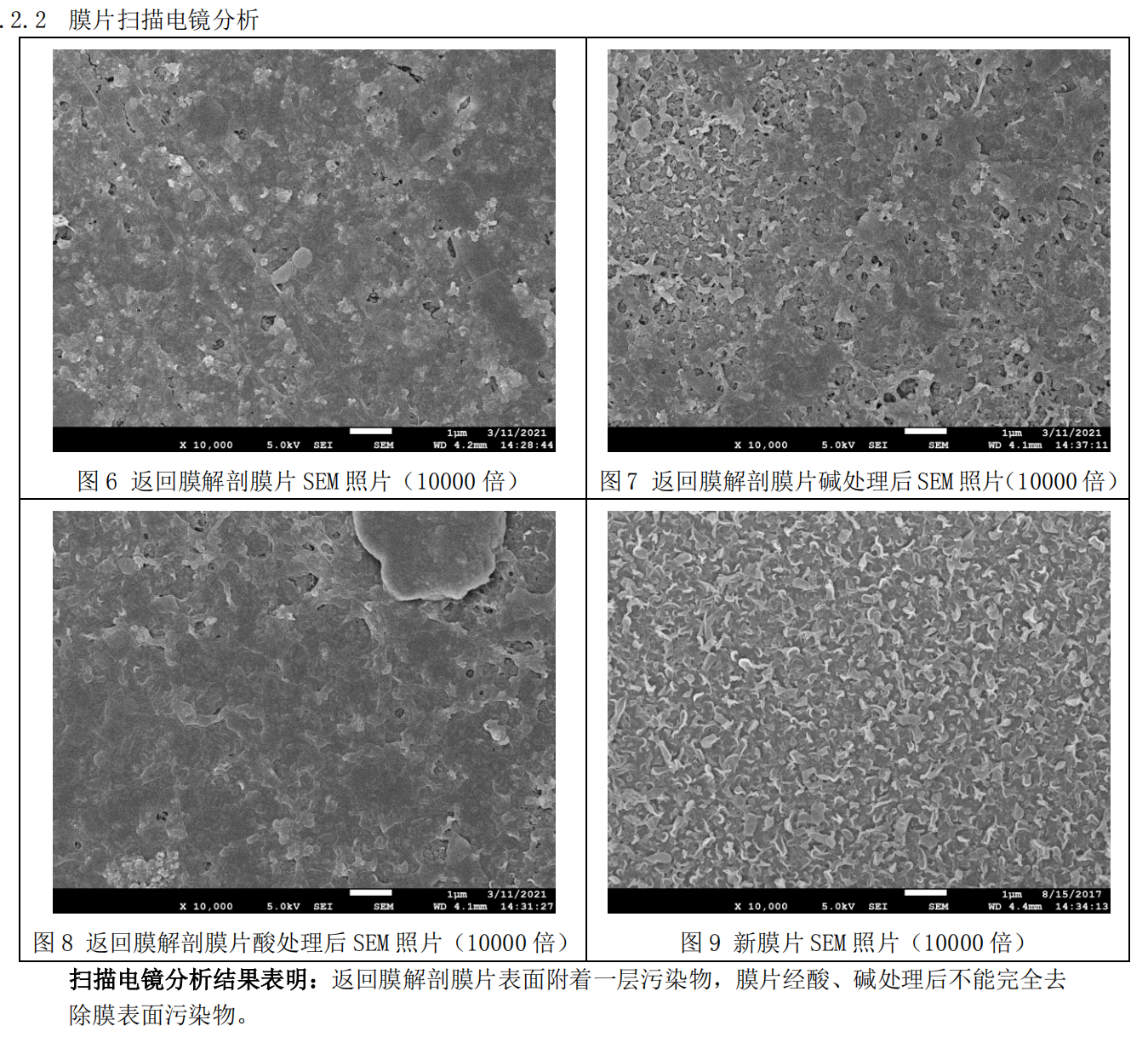 4.1進行離線清洗(堿洗、酸洗,并使用多種螯合配方),膜通量有一定恢復但難以有效恢復。污堵嚴重膜元件進行返廠處理,下附返廠膜元件廠家膜片掃描電鏡照片及返廠膜元件清洗情況及結(jié)論: