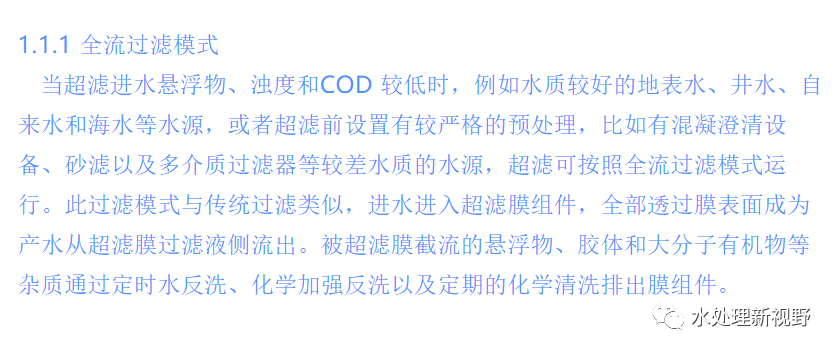濃水排放過(guò)濾和錯(cuò)流過(guò)濾模式操作同樣需要定時(shí)水反洗、化學(xué)加強(qiáng)反洗以及定期的化學(xué)清洗來(lái)恢復(fù)超濾膜過(guò)濾性能。全流過(guò)濾模式能耗低、操作壓力低,因而運(yùn)行成本更低;而錯(cuò)流過(guò)濾模式則能處理懸浮物含量更高的進(jìn)水。具體模式的選擇需要根據(jù)進(jìn)水中的懸浮物含量、濁度和COD來(lái)確定。