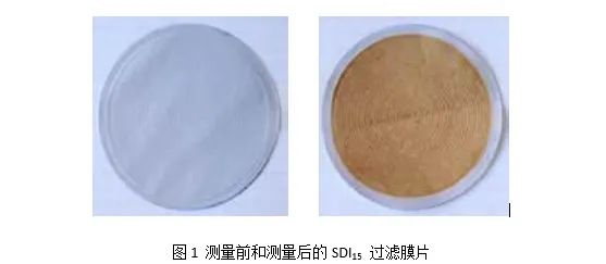 SDI 的測(cè)定是在直徑為47mm 孔徑為0.45μm 的微孔濾膜上連續(xù)加入一定壓力(30PSI,相當(dāng)于2.1kg/cm)的被測(cè)定水樣,記錄濾得500ml 水所需的時(shí)間Ti(秒)和連續(xù)過(guò)濾15 分鐘(T)后再次濾得500ml 水所需的時(shí)間Tf(秒),通過(guò)公式計(jì)算SDI 值;一般要求反滲透入口(即超濾產(chǎn)水)的SDI數(shù)值不得超過(guò)5。