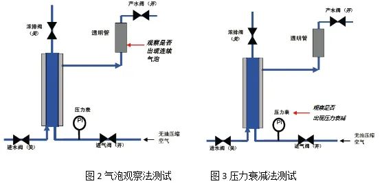 將膜組件中充滿測(cè)試所用的液體,使膜絲完全浸潤(rùn),膜絲所有的孔中都充滿了液體。在膜組件的進(jìn)水側(cè)緩慢通入無(wú)油壓縮空氣,且逐漸提高進(jìn)氣壓力,同時(shí)通過(guò)觀察產(chǎn)水側(cè)是否有氣泡連續(xù)溢出(產(chǎn)水閥門(mén)處于打開(kāi)狀態(tài))。通常通入空氣的壓力從0bar 開(kāi)始,逐漸增大到1.5bar。如果在1.5bar 的條件下,有連續(xù)的氣泡產(chǎn)生,表明膜組件存在缺陷。