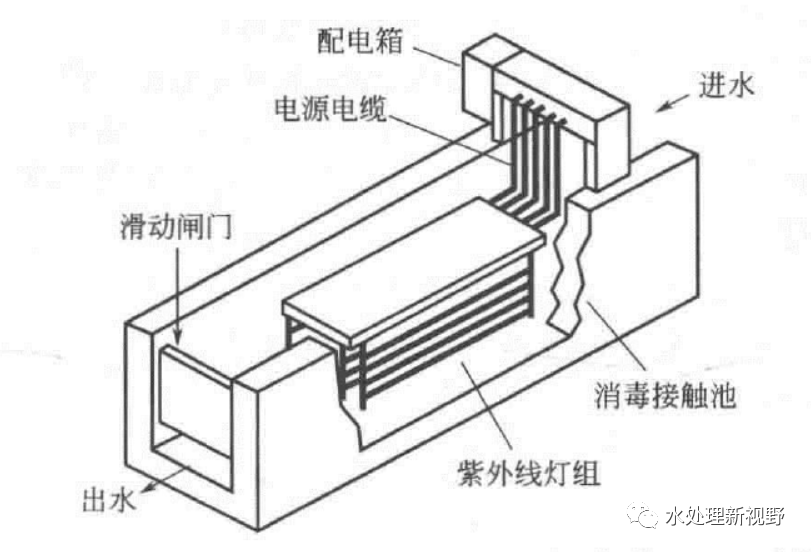水在重力作用下流經(jīng)紫外線消毒器,敞開式系統(tǒng)又可分為